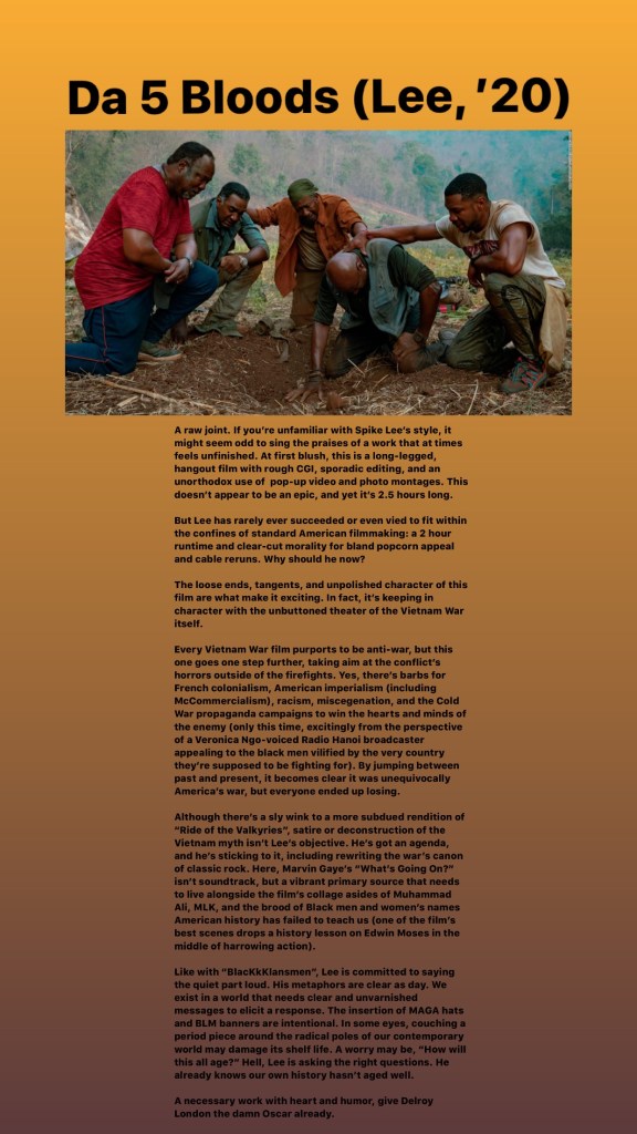 A raw joint. If you’re unfamiliar with Spike Lee’s style, it might seem odd to sing the praises of a work that, at times, feels unfinished. At first blush, this is a long-legged, hangout film with rough CGI, sporadic editing, and an unorthodox use of pop-up video and photo montages. But its loose ends, tangents, and unpolished character are what make it exciting. In fact, it’s keeping in character with the unbuttoned theater of the Vietnam War itself.